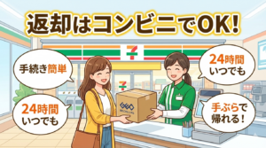 返却場所は、お近くのコンビニ(セブン-イレブン、ファミリーマートなど)や、郵便局、さらには配送業者による自宅引き取りも可能です。そして、なんと一部の商品を除き、全国のゲオの店舗(ゲオあれこれレンタル取扱店に限る)でも返却が可能なのです。仕事帰りに店舗に立ち寄って返却できるのは、他のサービスにはない大きな強みです。